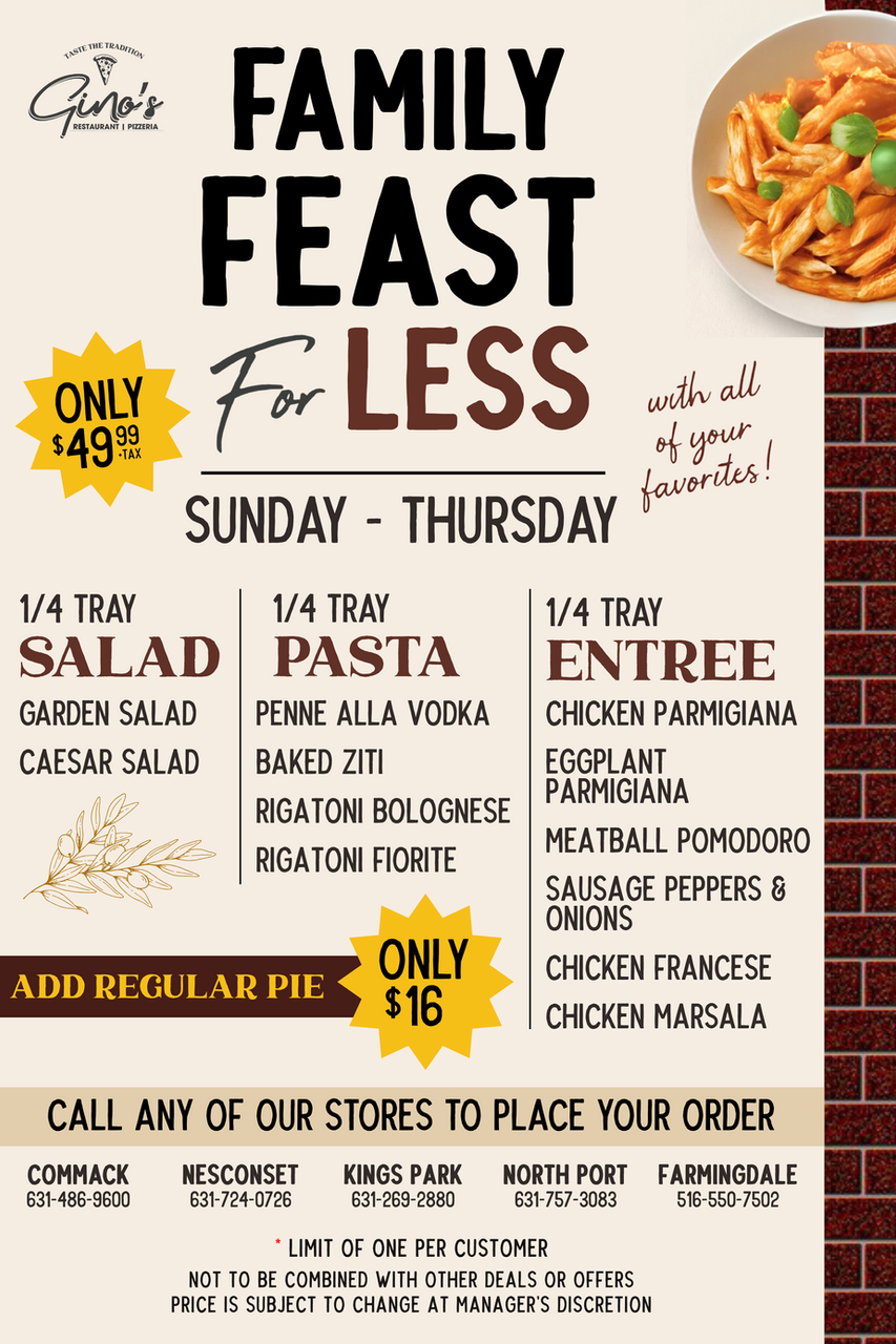 Today, Gino’s of Nesconset stands as a symbol of tradition, family, and the pursuit of excellence. Whether you're stopping by for a slice, a classic pasta dish, or one of our signature specialties, know that every meal is crafted with the same love and tradition that started in our grandmother’s kitchen.